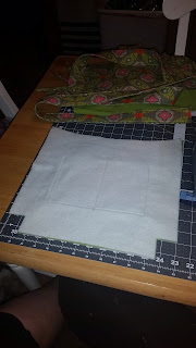 Fold the fabric for the pocket in half RS together, and sew around the outside edges, leaving 2 inches unsewn in one corner. Using that hole, reach in and grab the inside and pull it through, turning the pocket RS out.  Now turn the rough edges in and pin it so it matches the rest of the sewn edges. Place the pocket in the middle of one of the lining pieces and sew the sides and bottom to it, then if you want, make a seam down the middle of the pocket, so it turns it into 2 smaller pockets.